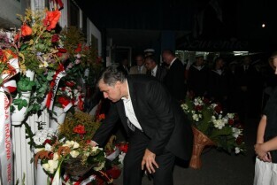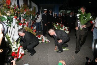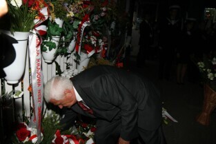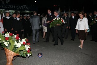 Gdańsk. 29. rocznica Porozumień Sierpniowych. Nz. kwiaty pod historyczną bramą nr 2 Stoczni Gdańskiej składa Prezydent RP Lech Kaczyński