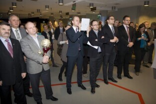 Podsumowanie dwu letniej działalności hali na granicy Gdańska i Sopotu. Gdańsk/Sopot, Ergo Arena. Nz. Paweł Adamowicz - Prezydent Gdańska, Magdalena Sekuła - Prezes Ergo Areny, Jacek Karnowski - Prezydent Sopotu.