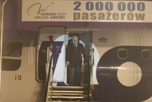 Na lotnisku Gdansk Lech Walesa Airport w Rębiechowie odprawiono już 2 miliony pasażerów. Z tej okazji wśród pasażerów kursu PLL LOT z Warszawy do Gdańska wylosowano darmowe vouchery na przelot z Gdańska. Nz. Lech Wałęsa