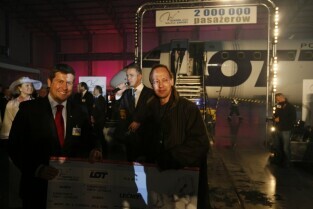 Na lotnisku Gdansk Lech Walesa Airport w Rębiechowie odprawiono już 2 miliony pasażerów. Z tej okazji wśród pasażerów kursu PLL LOT z Warszawy do Gdańska wylosowano darmowe vouchery na przelot z Gdańska. Nz. voucher wręcza Prezes PLL LOT Marcin Piróg
