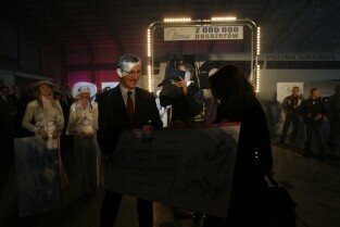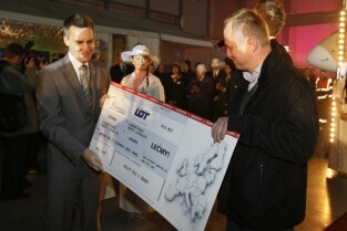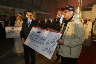 Na lotnisku Gdansk Lech Walesa Airport w Rębiechowie odprawiono już 2 miliony pasażerów. Z tej okazji wśród pasażerów kursu PLL LOT z Warszawy do Gdańska wylosowano darmowe vouchery na przelot z Gdańska. Nz. voucher wręcza Marszałek Woj. Pomorskiego Mieczysław Struk