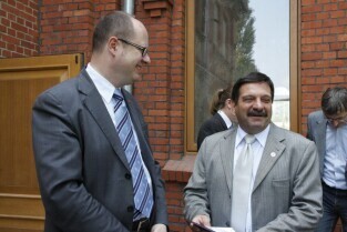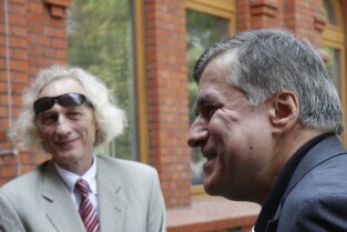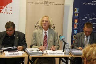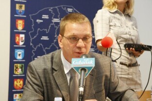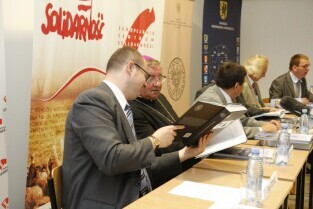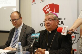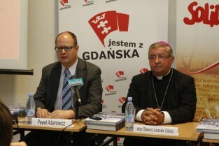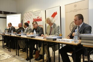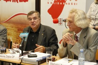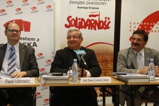 Stocznia Gdańska, sala BHP. Konferencja prasowa poświęcona obchodom 30. Rocznicy Sierpnia'80 w Gdańsku.