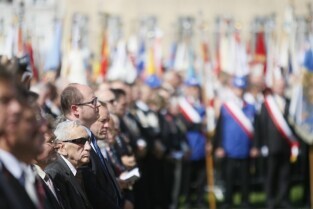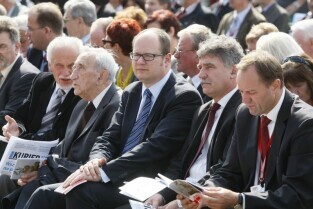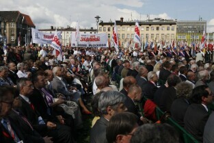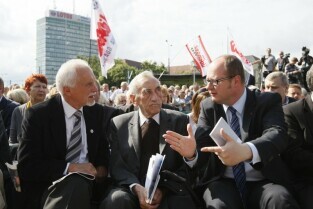 Gdańsk, Pl. Solidarności. Msza św. w 30 rocznicę powstania NSZZ Solidarność i podpisania Porozumień Sierpniowych w 1980 r. Nz. od prawej: Marszałek Woj. Pomorskiego Mieczysław Struk, Wojewoda Pomorski Roman Zaborowski, Prezydent Gdańska Paweł Adamowicz, były Premier RP Tadeusz Mazowiecki