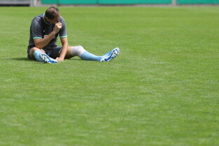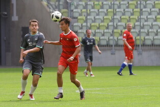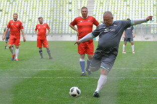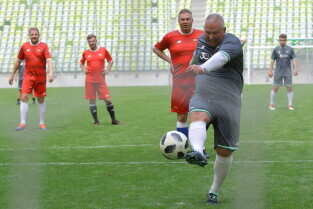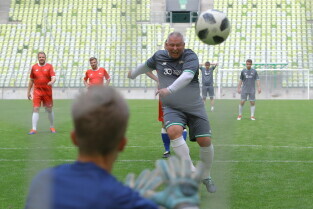 Gdańsk. AmberExpo i Przyjaciele - Wielki Festyn Rodzinny. Nz. Mecz Amberexpo kontra Przyjaciele, rzut karny wykonuję Andrzej Bojanowski Prezes Zarządu Amber Expo.