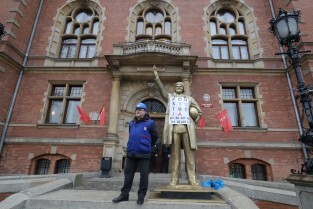 Gdańsk. VI Sesja Rady Miasta Gdańska. Protest przed budynkiem Rady Miasta Gdańska. Związkowcy ze Stoczni Gdańskiej ustawili figurę Donalda Tuska