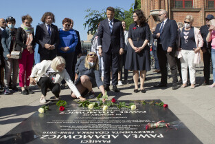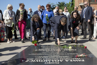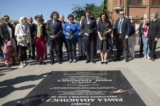 Gdańsk. Uroczystości 31 rocznicy wyborów czerwcowych 1989 z udziałem Aleksandry Dulkiewicz i Rafała Trzaskowskiego. Złożenie kwiatów przy tablicy pamięci Pawła Adamowicza