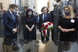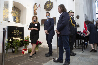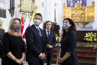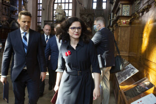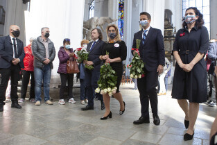 Gdańsk. Uroczystości 31 rocznicy wyborów czerwcowych 1989 z udziałem Aleksandry Dulkiewicz i Rafała Trzaskowskiego. Złożenie kwiatów przy grobie Macieja Płażyńskiego w kościele mariackim