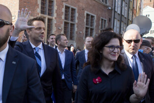 Gdańsk. Uroczystości 31 rocznicy wyborów czerwcowych 1989. Przejście Aleksandry Dulkiewicz, Magdaleny Adamowicz i Rafała Trzaskowskiego na Długi Targ