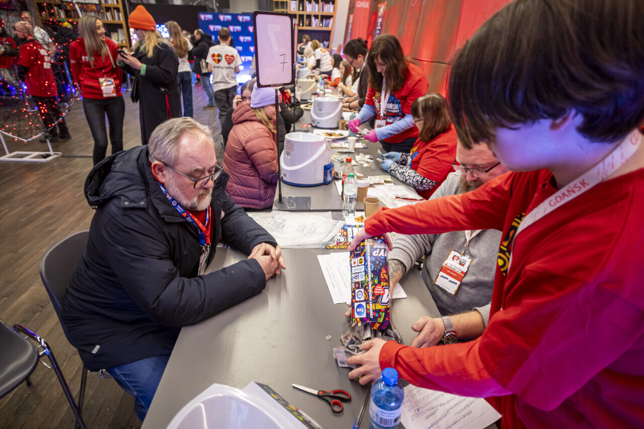 Gdańsk. W dniu 34 finału Wielkiej Orkiestry Świątecznej Pomocy na ulice miasta ruszyło tysiące wolontariuszy. W Europejskim Centrum Solidarności ulokował się główny sztab WOŚP. Nz. Poseł Piotr Adamowicz rozlicza się z zebranych pieniędzy