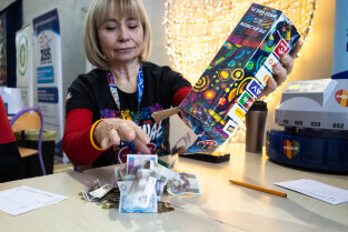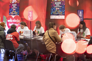 Gdańsk. W dniu 34 finału Wielkiej Orkiestry Świątecznej Pomocy na ulice miasta ruszyło tysiące wolontariuszy. W Europejskim Centrum Solidarności ulokował się główny sztab WOŚP. Nz. Wśród wolontariuszy Wioletta Krewniak, Dyrektor Biura Rady Miasta Gdańska.