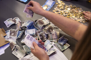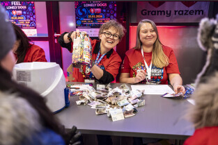Gdańsk. W dniu 34 finału Wielkiej Orkiestry Świątecznej Pomocy na ulice miasta ruszyło tysiące wolontariuszy. W Europejskim Centrum Solidarności ulokował się główny sztab WOŚP. Nz. wolontariusze rozliczają się z zebranych pieniędzy