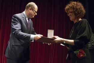 Uroczystość 35-lecia Pałacu Młodzieży w Gdańsku, która odbyła się w Operze Bałtyckiej. Nz. Prezydent Gdańska Paweł Adamowicz wręcza okolicznościową nagrodę, którą odbiera Dyrektor Pałacu Młodzieży Maria Pawłowska