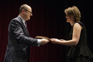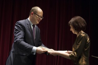 Uroczystość 35-lecia Pałacu Młodzieży w Gdańsku, która odbyła się w Operze Bałtyckiej. Nz. Prezydent Gdańska Paweł Adamowicz wręcza okolicznościowe nagrody