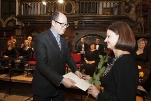 Gdańsk, Dwór Artusa. Koncert Jubileuszowy z okazji 35-lecia Polskiego Chóru Kameralnego Schola Cantorum Gedanensis. Nz. Prezydent Gdańska Paweł Adamowicz wręcza okolicznościową nagrodę chórzystom