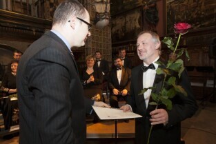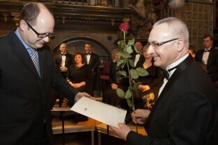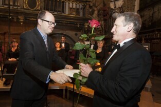 Gdańsk, Dwór Artusa. Koncert Jubileuszowy z okazji 35-lecia Polskiego Chóru Kameralnego Schola Cantorum Gedanensis. Nz. Prezydent Gdańska Paweł Adamowicz wręcza okolicznościową nagrodę chórzystom, którą odbiera Dyrygent Jan Łukaszewski