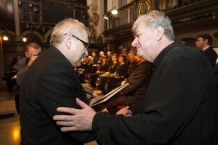 Gdańsk, Dwór Artusa. Koncert Jubileuszowy z okazji 35-lecia Polskiego Chóru Kameralnego Schola Cantorum Gedanensis. Nz. Wiceprzewodniczący Rady Miasta Gdańska Jacek Teodorczyk i Dyrygent Jan Łukaszewski (po prawej)