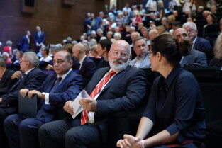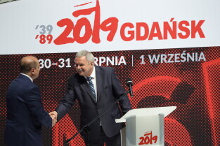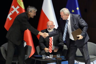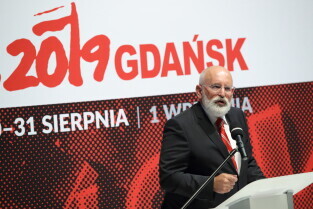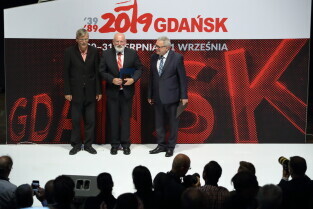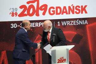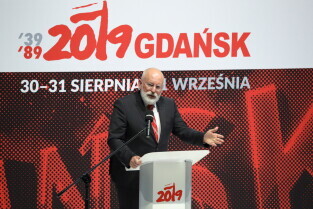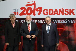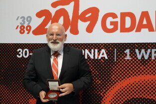 Gdańsk, 39. rocznica Porozumień Sierpniowych. Medale Wdzięczności otrzymali: Frans Timmermans, Myrosław Marynowycz i Gábor Demszky.