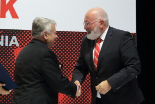 Gdańsk, 39. rocznica Porozumień Sierpniowych. Medale Wdzięczności otrzymali: Frans Timmermans, Myrosław Marynowycz i Gábor Demszky. Nz. Frans Timmermans.