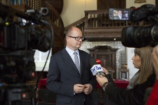 Co nam dała metropolia? Konferencja prasowa z okazji 3-lecia Gdańskiego Obszaru Metropolitalnego. Gdańsk Długi Targ, Sień Gdańska. Nz. Prezydent Gdańska Paweł Adamowicz