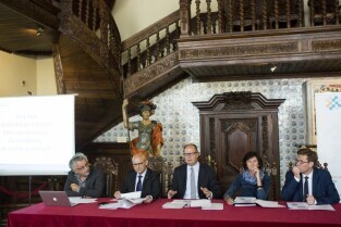 Co nam dała metropolia? Konferencja prasowa z okazji 3-lecia Gdańskiego Obszaru Metropolitalnego. Gdańsk Długi Targ, Sień Gdańska. Nz. od lewej: Pełnomocnik GOM ds. ekonomii społecznej Piotr Wołkowiński, Starosta Powiatu Wejherowskiego Józef Reszke, Prezydent Gdańska Paweł Adamowicz, Wójt Gminy Pszczółki Hanna Brejwo, Dyrektor biura GOM Michał Glaser