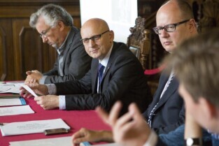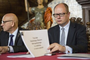 Co nam dała metropolia? Konferencja prasowa z okazji 3-lecia Gdańskiego Obszaru Metropolitalnego. Gdańsk Długi Targ, Sień Gdańska. Nz. od lewej: Starosta Powiatu Wejherowskiego Józef Reszke, Prezydent Gdańska Paweł Adamowicz, Wójt Gminy Pszczółki Hanna Brejwo