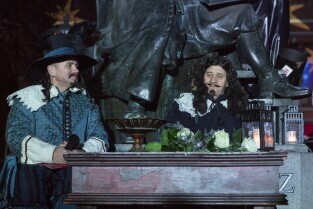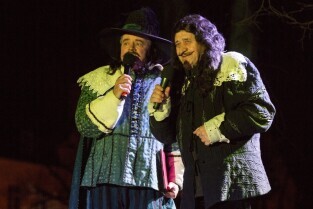 Widowisko plenerowe "405 Urodziny Jana Heweliusza". Gdańsk, Stare Miasto. Nz. Michał Juszczakiewicz jako Edmund Halley i Florian Staniewski jako Jan Heweliusz