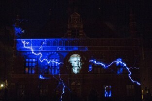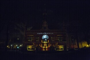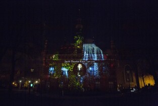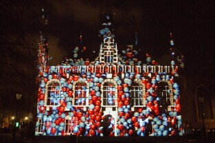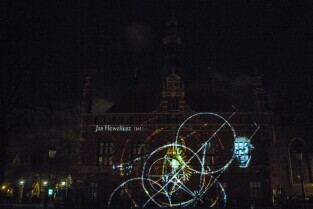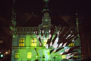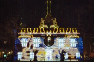 Widowisko plenerowe "405 Urodziny Jana Heweliusza". Gdańsk, Stare Miasto. Nz. pokaz Video Mappingu na Ratuszu Starego Miasta