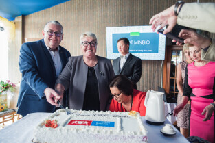 Gdańsk. 40-lecie Domu Pomocy Społecznej "Polanki". Nz. (od lewej) Posłanka Małgorzata Chmiel, Wiceprezydent Gdańska Piotr Kowalczuk i Henryka Krzywonos-Strycharska