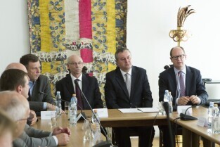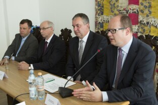 45-lecie Akademii Wychowania Fizycznego i Sportu w Gdańsku. Konferencja prasowa. Nz. od prawej: Prezydent Gdańska Paweł Adamowicz, Rektor AWFiS prof. Waldemar Moska, Poseł do Parlamentu Europejskiego Janusz Lewandowski, Prezydent Sopotu Jacek Karnowski