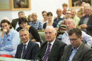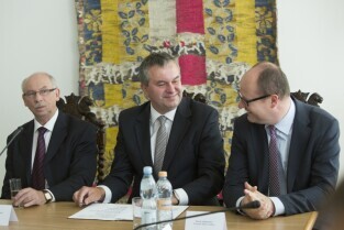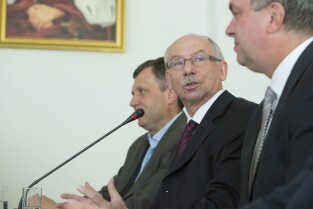45-lecie Akademii Wychowania Fizycznego i Sportu w Gdańsku. Konferencja prasowa. Nz. od lewej: Poseł do Parlamentu Europejskiego Janusz Lewandowski, Rektor AWFiS prof. Waldemar Moska, Prezydent Gdańska Paweł Adamowicz