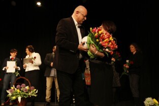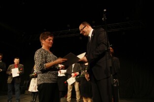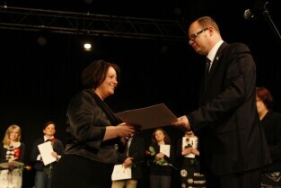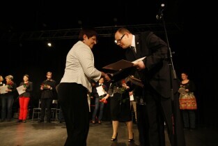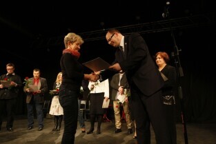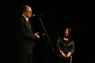 Gdańsk Orunia, Dworek Artura. Uroczystość 45-lecia Gdańskiego Archipelagu Kultury. Nz. Prezydent Gdańska Paweł Adamowicz wręcza okolicznościową nagrodę, którą odbiera Dyrektor GAK Teresa Kuśmierska