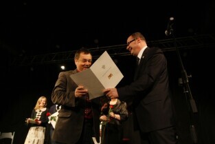 Gdańsk Orunia, Dworek Artura. Uroczystość 45-lecia Gdańskiego Archipelagu Kultury. Nz. Prezydent Gdańska Paweł Adamowicz wręcza okolicznościowe nagrody