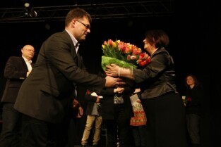 Gdańsk Orunia, Dworek Artura. Uroczystość 45-lecia Gdańskiego Archipelagu Kultury. Nz. gratulacje składa Piotr Wróblewski (Gdańska Fundacja Innowacji Społecznej), które odbiera Dyrektor GAK Teresa Kuśmierska