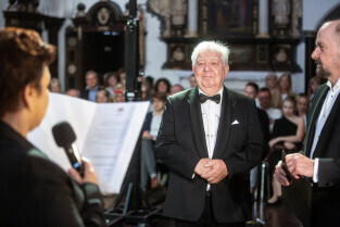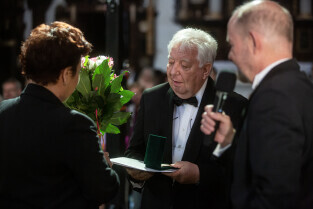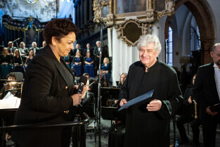 Gdańsk. W katedrze Oliwskiej odbył się koncert z okazji 45-lecia Polskiego Chóru Kameralnego. Muzycy zagrali Mszę H-moll Jana Sebastiana Bacha. Nz. Odznaczenie p. Andrzeja Macierzyńskiego Medalem Prezydenta Miasta Gdańska.