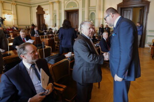 Gdańsk. 49 nadzwyczajna sesja Rady Miasta Gdańska. Nz. Wicemarszałek Senatu Bogdan Borusewicz, Radny Kazimierz Koralewski i Ewa Lider -Nowoczesna.