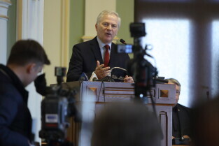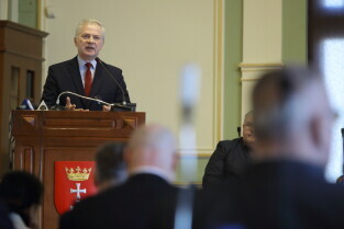 Gdańsk. 49 nadzwyczajna sesja Rady Miasta Gdańska. Nz. Europoseł Janusz Lewandowski.
