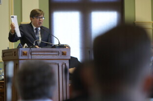 Gdańsk. 49 nadzwyczajna sesja Rady Miasta Gdańska. Nz. Poseł Tadeusz Aziewicz.