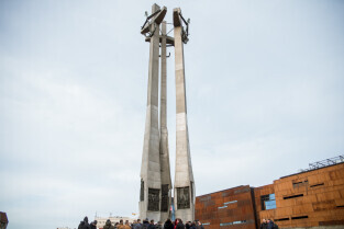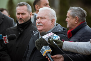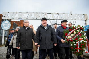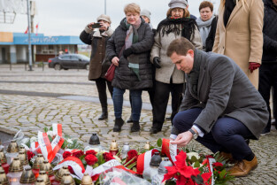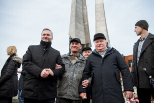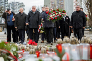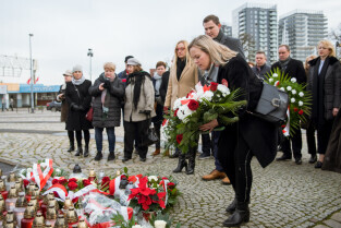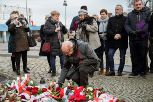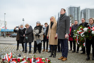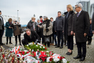 Gdańsk, Plac Solidarności. 49. rocznica Grudnia '70. Pod pomnikiem Poległych Stoczniowców kwiaty złożył m.in. zastępca prezydent Gdańska Piotr Grzelak i prezydent Lech Wałęsa