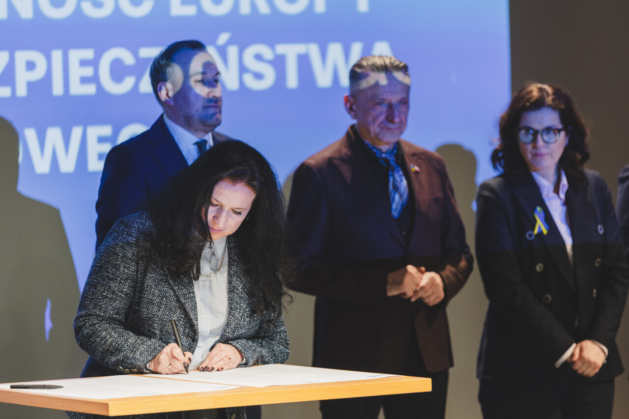 Gdańsk, M2WŚ. 4. rocznica rozpoczęcia pełnoskalowej wojny w Ukrainie - wernisaż wystawy i konferencja. Nz.Podpisanie Deklaracji Mariupolskiej przez przedstawicieli Obszaru Metropolitalnego Gdańsk–Gdynia–Sopot oraz Muzeum II WŚ oraz Europejskiego Centrum Solidarności