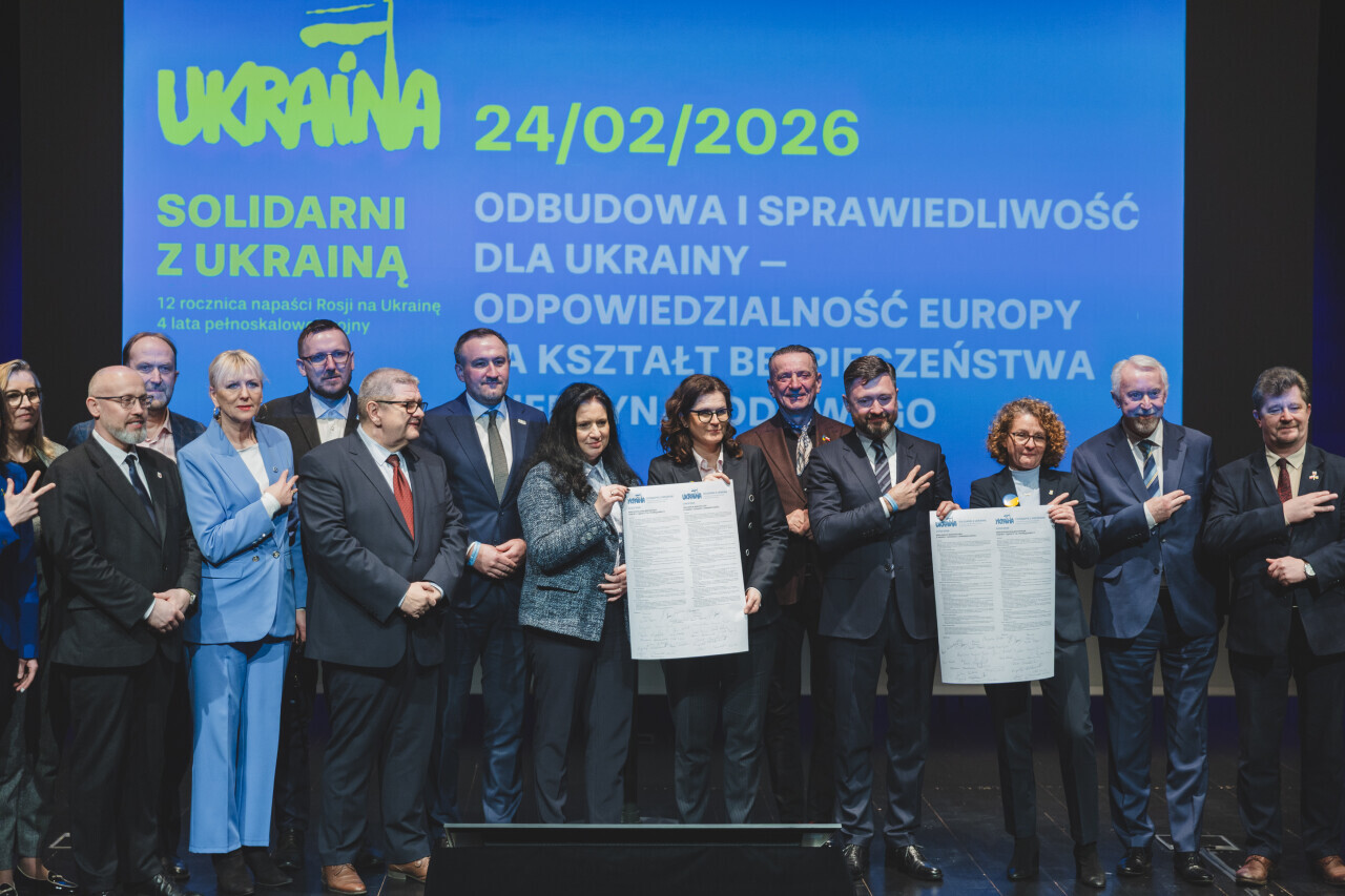 Gdańsk, M2WŚ. 4. rocznica rozpoczęcia pełnoskalowej wojny w Ukrainie - wernisaż wystawy i konferencja. Nz.Podpisanie Deklaracji Mariupolskiej przez przedstawicieli Obszaru Metropolitalnego Gdańsk–Gdynia–Sopot oraz Muzeum II WŚ oraz Europejskiego Centrum Solidarności