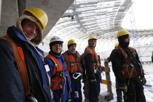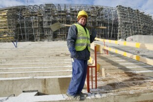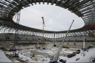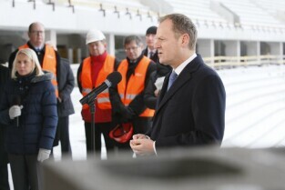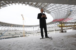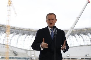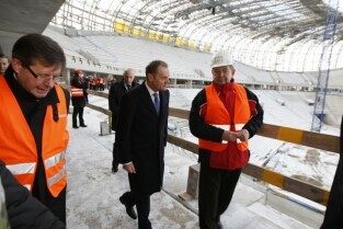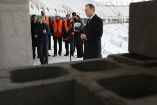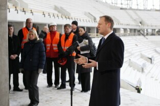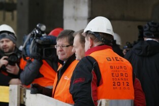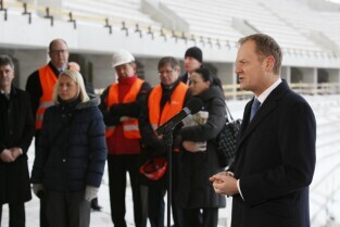 Gdańsk Letnica, budowa stadionu PGE Arena. Konferencja prasowa Premiera RP Donalna Tuska zorganizowana z okazji 500 dni do rozpoczęcia UEFA EURO 2012 w Polsce.