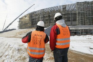 Gdańsk Letnica, budowa stadionu PGE Arena. Konferencja prasowa Premiera RP Donalna Tuska zorganizowana z okazji 500 dni do rozpoczęcia UEFA EURO 2012 w Polsce. Nz. Premier Donald Tusk i Prezes BIEG2012 Ryszard Trykosko