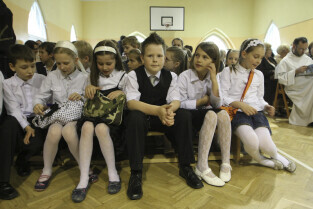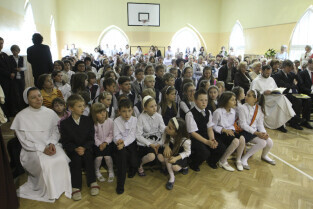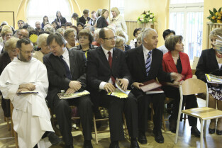 50 - lecie Szkoły Podstawowej nr 50 im. Emilii Plater przy ul. Grobla IV w Gdańsku. Nz. od lewej: oo. Jacek Krzysztofowicz (Opat Zakonu Dominikanów w Gdańsku), oraz absolwenci szkoły: Roman Perucki (Dyrektor Filharmonii Bałtyckiej) i Paweł Adamowicz (Prezydent Gdańska)