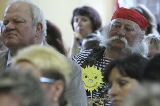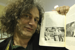 50 - lecie Szkoły Podstawowej nr 50 im. Emilii Plater przy ul. Grobla IV w Gdańsku. Nz. absolwent Maciej Kosycarz pokazuje archiwalne zdjęcie, na którym jest po środku. Zdjęcie autorstwa Zbigniewa Kosycarza (ojca pana Macieja) znajduje się w książce poświęconej historii szkoły