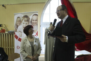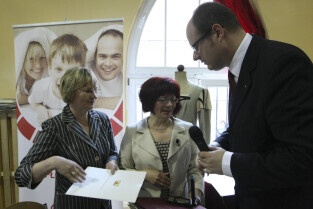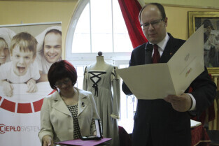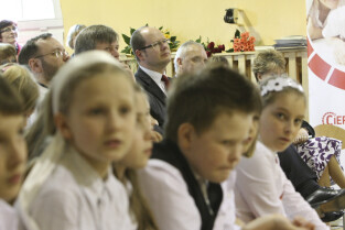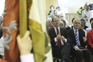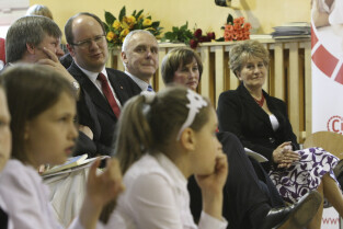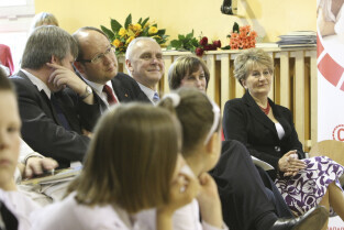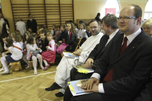 50 - lecie Szkoły Podstawowej nr 50 im. Emilii Plater przy ul. Grobla IV w Gdańsku. Nz. od lewej: oo. Jacek Krzysztofowicz (Opat Zakonu Dominikanów w Gdańsku), oraz absolwenci szkoły: Roman Perucki (Dyrektor Filharmonii Bałtyckiej) i Paweł Adamowicz (Prezydent Gdańska), po prawej Jerzy Jasiński (z-ca dyrektora Wydziału Edukacji UMG)