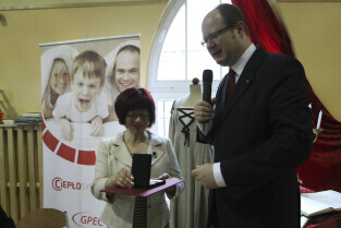 50 - lecie Szkoły Podstawowej nr 50 im. Emilii Plater przy ul. Grobla IV w Gdańsku. Nz. Prezydent Gdańska Paweł Adamowicz (absolwent szkoły) wręcza gratulacje dyrektor SP 50 pani Lucynie Hasse