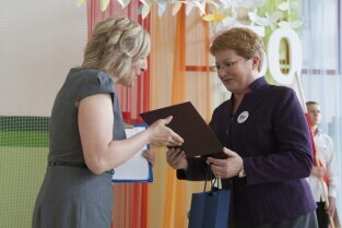 Uroczystość 50-lecia istnienia Szkoły Podstawowej nr 87 w Gdańsku Sobieszewie. Nz. Prezydent Gdańska Paweł Adamowicz wręcza nagrody nauczycielom