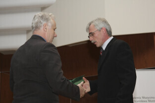 50-lecie Technikum Samochodowego w Gdańsku. Gala odbyła się w auli Akademii Muzycznej. Nz. Pomorski Kurator Oświaty Zdzisław Szudrowicz (po lewej) i Dyrektor Technikum Samochodowego mgr inż. Mirosław Sreberski (po prawej)