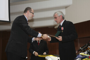 50-lecie Technikum Samochodowego w Gdańsku. Gala odbyła się w auli Akademii Muzycznej. Nz. Prezydent Gdańsk Paweł Adamowicz (po lewej) i Dyrektor Technikum Samochodowego mgr inż. Mirosław Sreberski (po prawej)