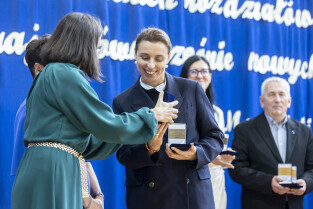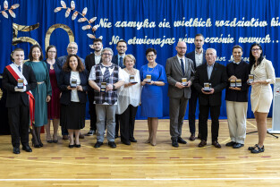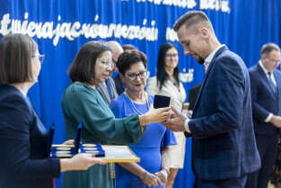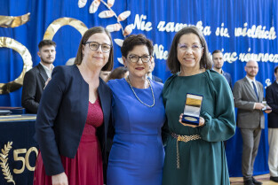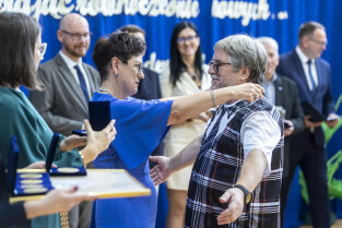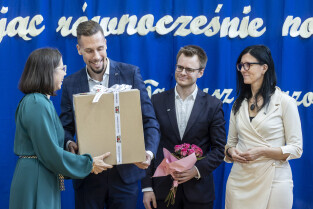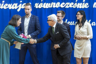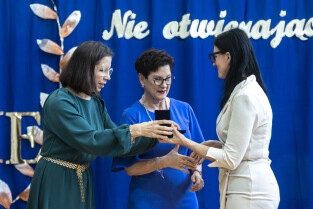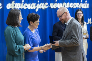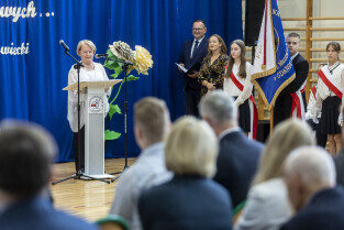 Gdańsk. Jubileusz 50-lecia szkoły podstawowej nr 89, na Żabiance. Nz. życzenia dyrektor szkoły Beacie Kapuścińskiej składają radni: Łukasz Bejm, Jan Perucki i Sylwia Cisoń